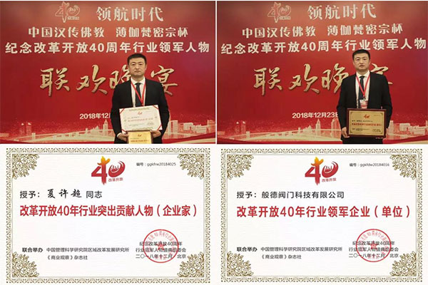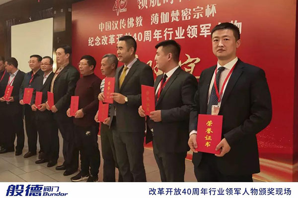 般德閥門科技有限公司董事長(zhǎng)夏許超先生獲“改革開(kāi)放40年行業(yè)突出貢獻(xiàn)企業(yè)家”榮譽(yù)稱號(hào),般德閥門科技有限公司獲“改革開(kāi)放40年行業(yè)領(lǐng)軍企業(yè)”榮譽(yù)稱號(hào)。