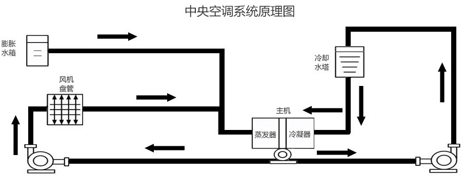 大型中央空調主要由制冷機、冷卻水循環系統、冷凍水循環系統、風機盤管系統和散熱水塔組成。